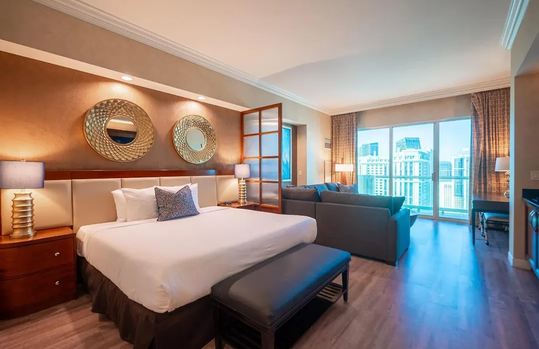 La villa No Resort Fee Strip View Balcony+ Free Valet+Pool también incluye nevera, una placa y menaje de cocina en la cocina bien equipada proporcionada para que los huéspedes puedan cocinar fácilmente sus propias comidas. Los huéspedes pueden disfrutar de la cena en el restaurante Gordon Ramsay Burger, situado a 1 km. La estación de autobuses Planet Hollywood está a unos minutos a pie de la villa, lo que permite a los huéspedes descubrir fácilmente Las Vegas.